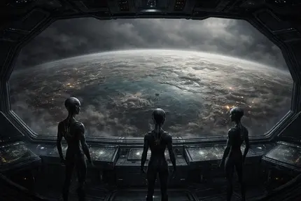 Das Raumschiff Xylanthrop war kein Schiff im menschlichen Sinne. Es war eine kristalline Struktur, ein Fraktal aus lebendigem Silizium und schimmerndem Plasma, das sich wie eine gigantische, eingefrorene Flamme über den Äquator der Erde gelegt hatte. In seinem Inneren pulsierte kein Lärm von Maschinen, sondern ein rhythmisches, elektrostatisches Summen, der Herzschlag einer Zivilisation, die das Konzept der Zeit längst überwunden hatte. Auf der Brücke, einem gewölbten Raum aus flüssigem Licht, standen die drei Beobachter der Vorhut. Sie waren Humanoiden, doch ihre Evolution hatte andere Pfade gewählt. Ihre Haut war von der Farbe des Quecksilbers, glatt und porenfrei, und ihre Augen waren facettierte Prismen, die das gesamte elektromagnetische Spektrum wahrnahmen. Sie trugen keine Kleidung, sondern feine Gespinste aus gravitativer Energie, die ihre schlanken, sehnigen Körper umhüllten.