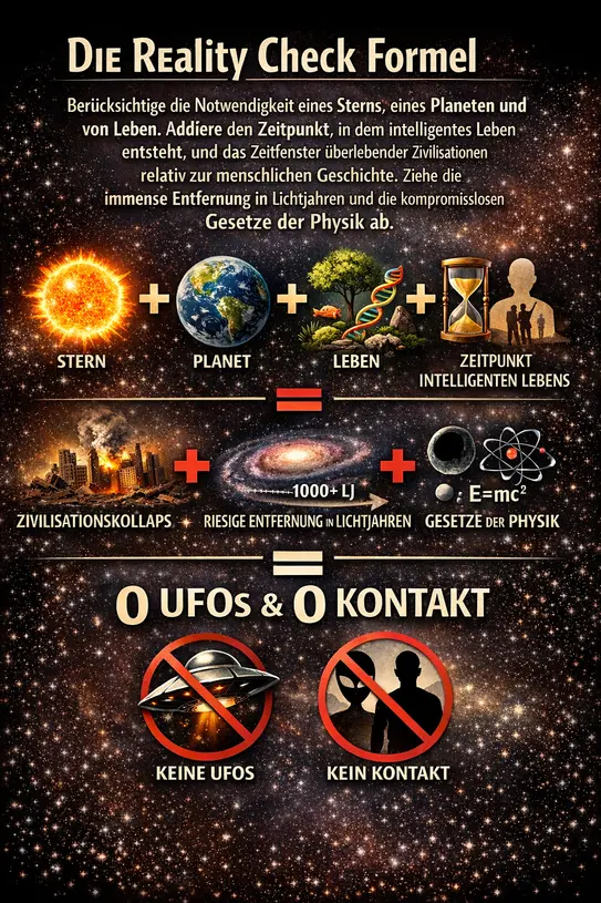 - Die Zeitbarriere: Die zeitliche Diskrepanz zwischen der Entwicklung zweier Intelligenzen macht ein gleichzeitiges Aufeinandertreffen in den Milliarden Jahren der galaktischen Geschichte statistisch absolut unwahrscheinlich.